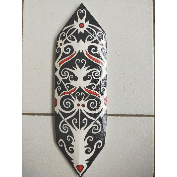Objek buatan manusia aktiviti : Perhiasan terabai kayu ukiran kaum iban yang laris dijual gerai joseph di ekspo perkayuan dan sme sarawak 2019 di bcck. Borneo sarawak, iban tribal shield motif .